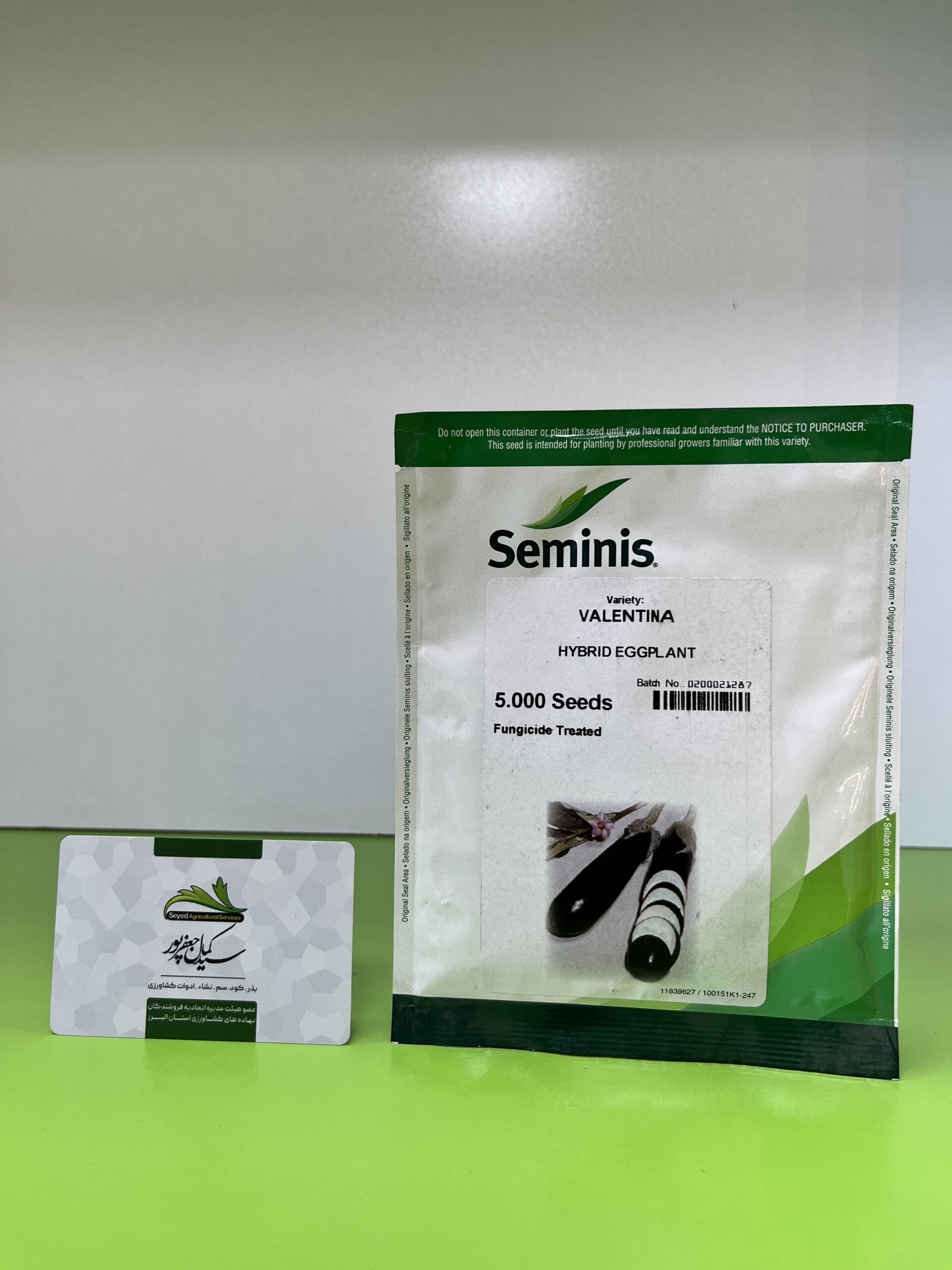 بذر بادمجان والنتینا محصول شرکت سمینیس آمریکا بوده که در پاکت های 5000 عددی به بازار عرضه می گردد. بادمجان والنتینا جزء ارقام بادمجان قلمی محسوب شده که در سال های اخیر در استان های اصفهان و هرمزگان مورد کشت قرار گرفته است. به طوری که این رقم در استان اصفهان در گلخانه های چوبی مورد کشت قرار گرفته و در سال های اخیر به رقمی محبوب در بین گلخانه داران تبدیل شده است. از ویژگی های بارز رقم بادمجان والنتینا می توان به کیفیت بالای رنگ میوه اشاره نمود به طوری که از این نظر در بین ارقام بادمجان قلمی از برتری خاصی برخوردار می باشد. از دیگر ارقام بادمجان قلمی سمینیس می توان به ارقام بادمجان هادرین،فاسیلیس و 1779 اشاره کرد.