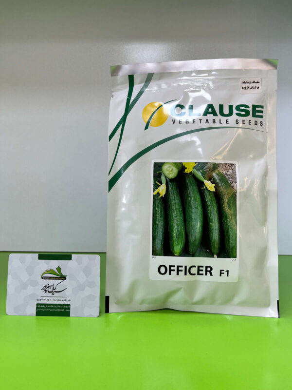 بذر خیار آفیسر تولید شرکت کلوز فرانسه رقمی زودرس با دوره برداشت طولانی مدت است که قابلیت کشت در تمامی فصول را داراست. این رقم همچنین رقمی پرمحصول با بوتههای بسیار قوی است. محصول این رقم، قلمی با شیارهای متوسط میباشد که از اندازه یکنواخت و هماهنگ برخوردار است. طول میوه آن 17 تا 20 سانتیمتر است و به رنگ سبز تیره میباشد