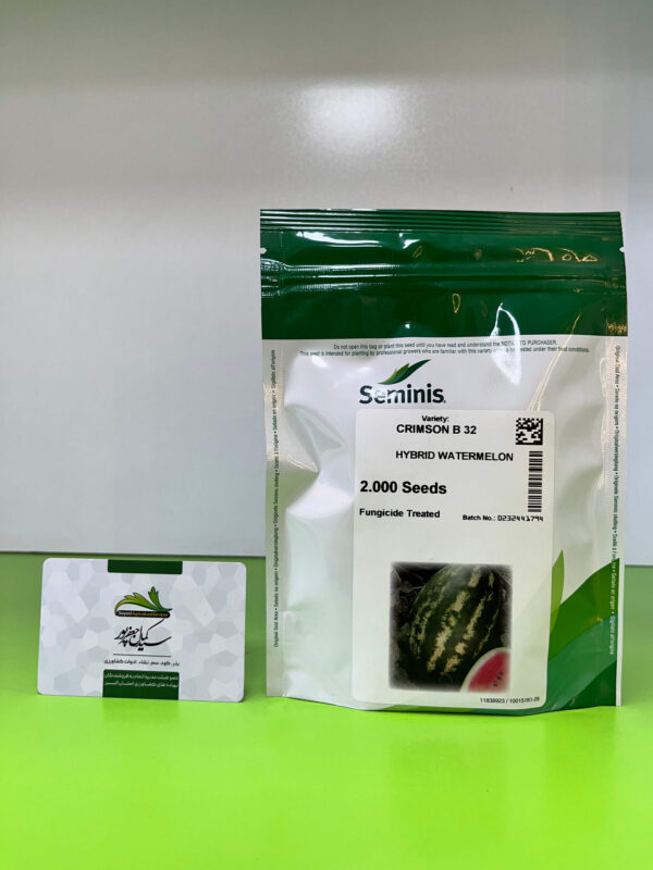 بذر هندوانه کریمسون بی 32 (B32) یکی از بهترین بذرهای صادراتی کریمسون سوئیت از شرکت سمینیس و رقمی نسبتاً زودرس است. بذر هندوانه B32 به عنوان رقم بذر هندوانه هیبرید با عملکرد بالا معرفی شده است. بذر هندوانه B32 همانند گالاتا قابلیت تشکیل میوه در هر دو شرایط سرد و گرم را دارد. این رقم همانند فارائو و گالاتا دارای گوشت سفت و پوسته ضخیم و بازارپسند میباشد. بنابراین گزینه مناسبی جهت صادرات محسوب میشود. پوست میوه به رنگ سبز تیره با نوار های مشخص و گوشت میوه قرمز خوش رنگ، سفت و بدون رگه های فیبری میباشد.