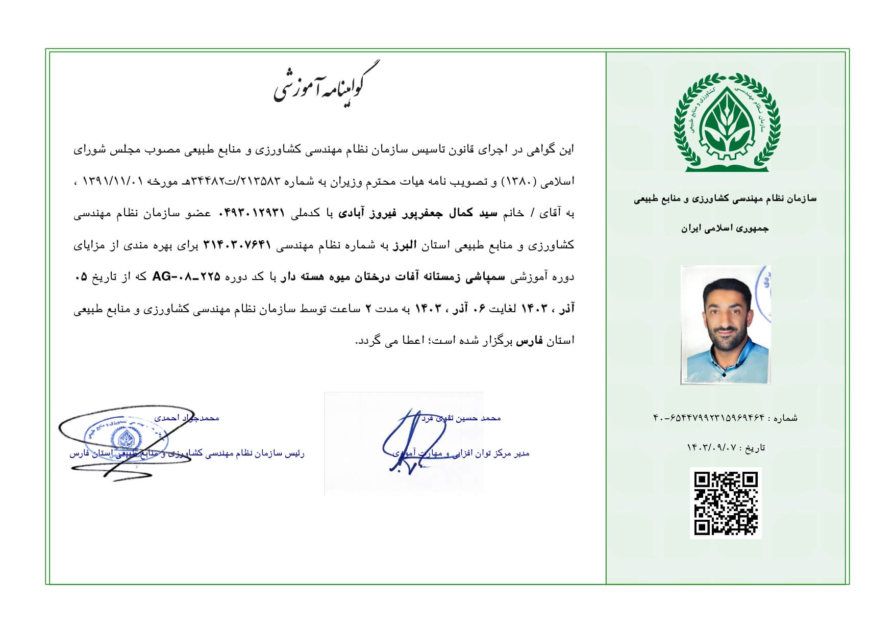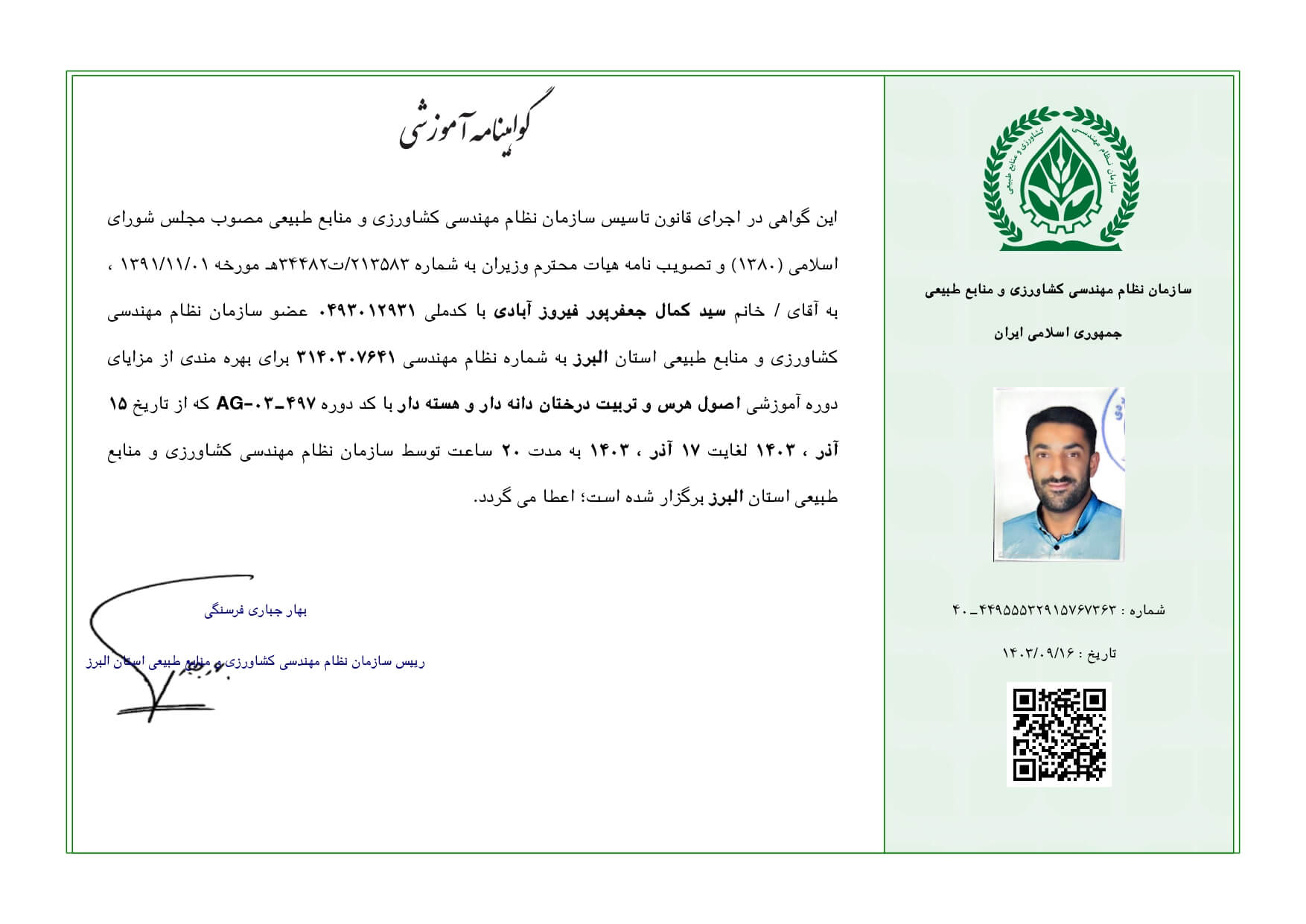 من، سید کمال جعفرپور، نایب رئیس اتحادیه فروشندگان نهاده‌های کشاورزی استان البرز هستم. بیش از ۳۰ سال است که در زمینه فروش انواع نهاده‌های کشاورزی از جمله بذر، کود، سم، نشاء، و ادوات کشاورزی فعالیت می‌کنم. در این سال‌ها توانسته‌ام تجربیات ارزشمندی در این حوزه کسب کنم و به کشاورزان و گلخانه‌داران در بهبود عملکرد و بهره‌وری کمک کنم.
